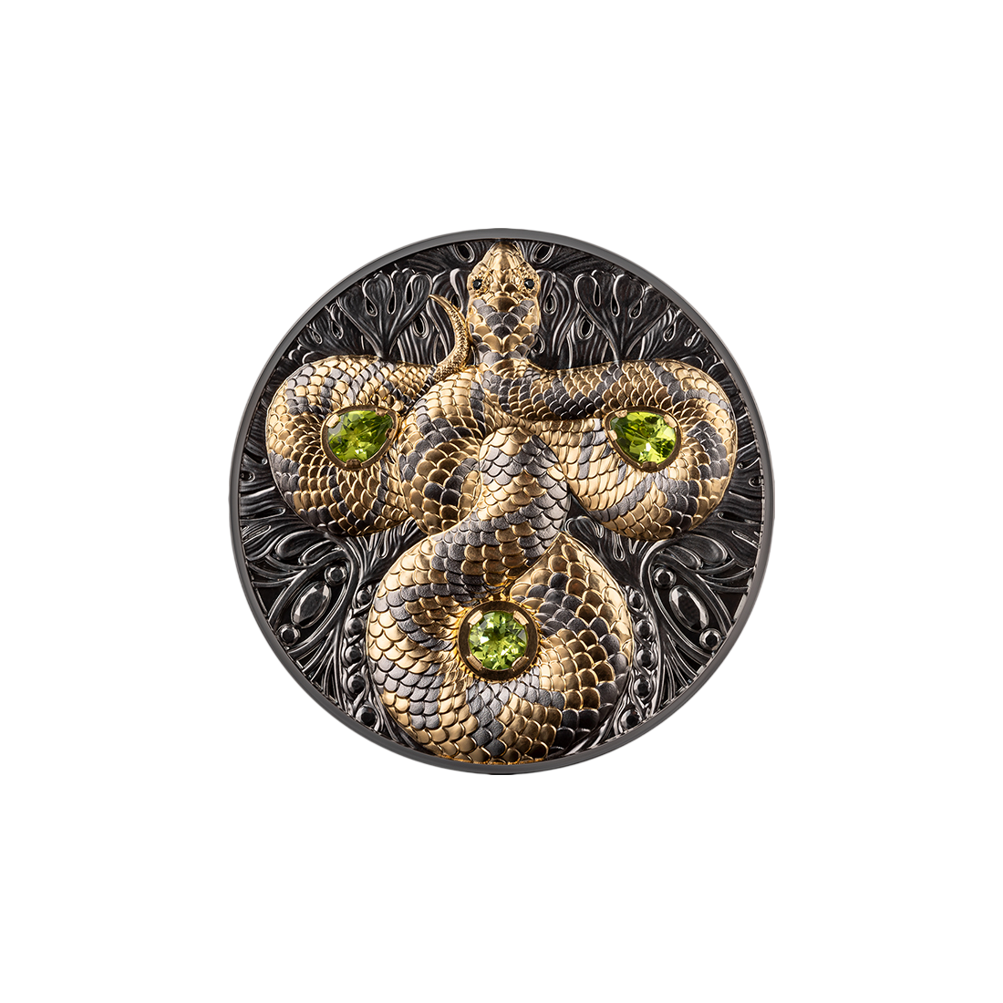 Moneta Wąż szczęścia 2026 nie jest zwykłym kruszcem – to dzieło z pogranicza sztuki i luksusu, stworzone przy użyciu technologii High Relief (wysoki relief), która nadaje detalom niemal trójwymiarową głębię. Rewers zachwyca kontrastem uzyskanym dzięki selektywnemu złoceniu oraz pokryciu części powierzchni ciemnym, tajemniczym rutenem. Centralnym punktem kompozycji jest wizerunek węża, którego oczy wykonano z naturalnych kamieni szlachetnych – perydotów. Dodatkowego blasku dodają wstawki z czarnych diamentów, co sprawia, że walor ten staje się unikatową biżuterią inwestycyjną.