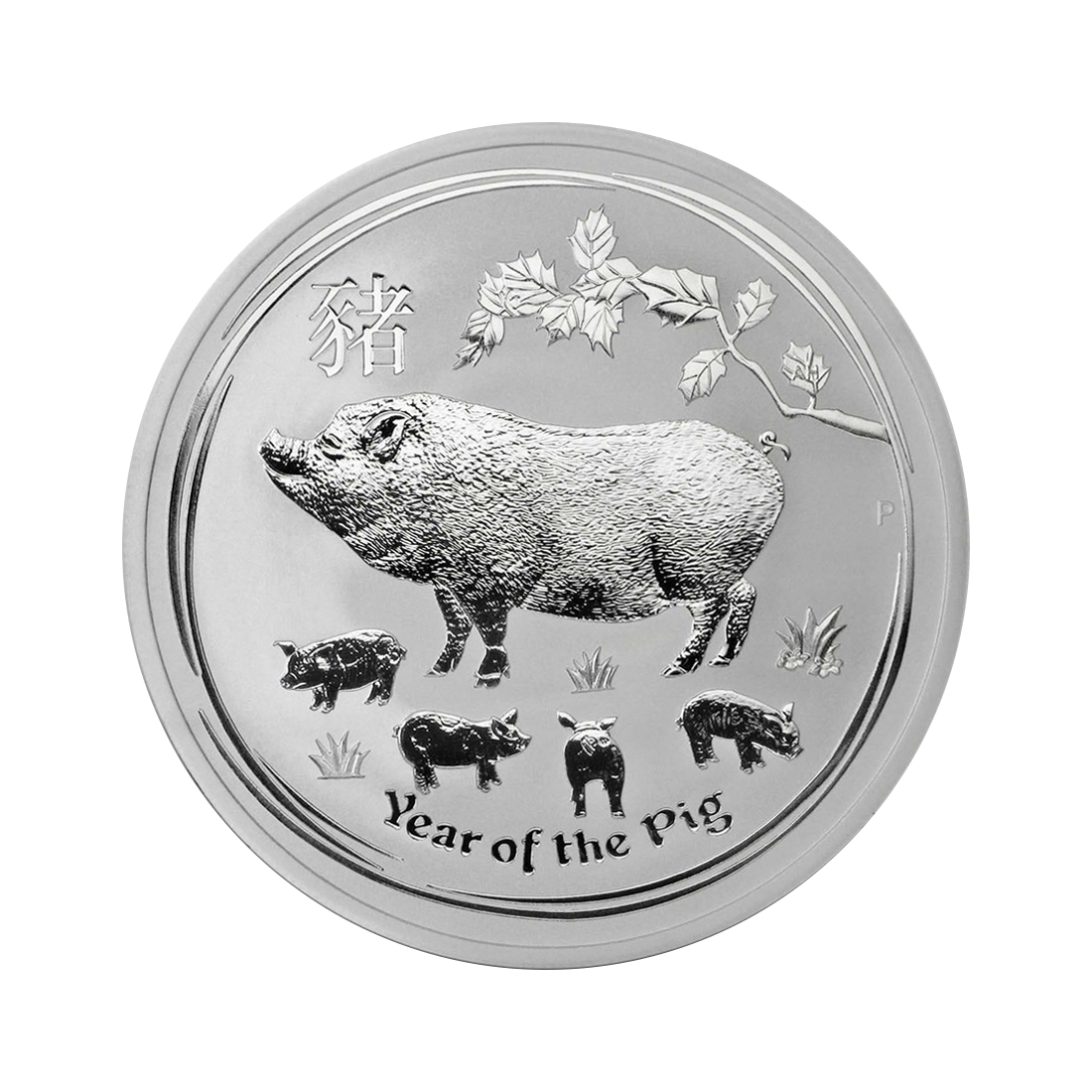 Rewers przedstawia świnię z czterema prosiętami. Nad nimi widoczne są wygrawerowane, stylizowane liście. Projekt zawiera również chiński znak świni, napis Rok Świni i tradycyjny znak mennicy Perth Mint P.