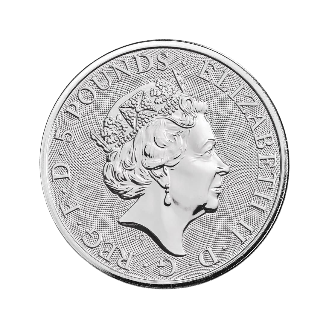 Awers monety przedstawia podobiznę brytyjskiej królowej Elżbiety II. Wokół rozmieszczono napis – Elizabeth II D. G. REG. F. D. – co po rozwinięciu tłumaczymy jako: Elżbieta II Królowa z Bożej Łaski, Obrończyni Wiary. Prócz tego widnieje tam również wartość nominalna (5 POUNDS) oraz inicjały projektodawcy – JC.