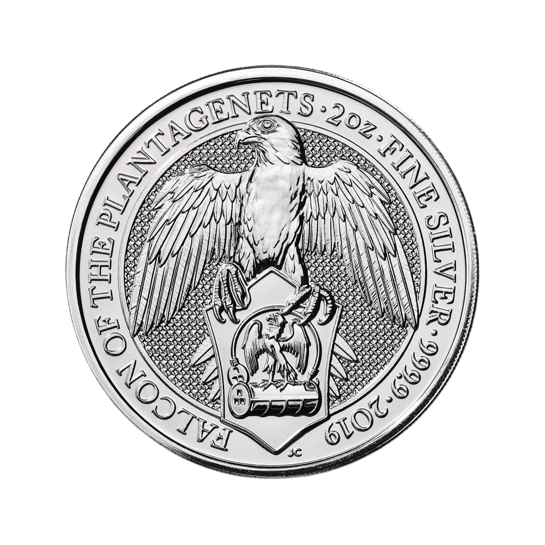 Rewers monety przedstawia Sokoła. W szponach sokoła umieszczono herb. Na otoku znajdują się takie informacje jak: waga (2 oz), próba kruszcu (999,9), rok bicia (2017) oraz napis Falcon of Plantagenets. Na rewersie można dostrzec inicjały designera monety – JC.