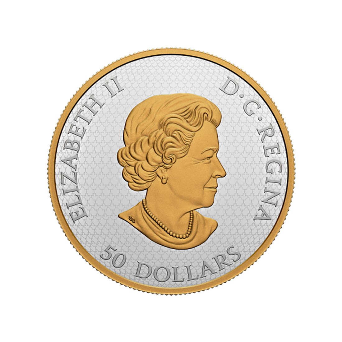 The obverse features a gilded image of Queen Elizabeth II. The background for the figure is the characteristic Canadian maple leaf – small leaves form an elegant pattern. Around the portrait, the inscriptions "ELIZABETH II" "D.G. REGINA" and the nominal value of the coin – 50 dollars – are placed.