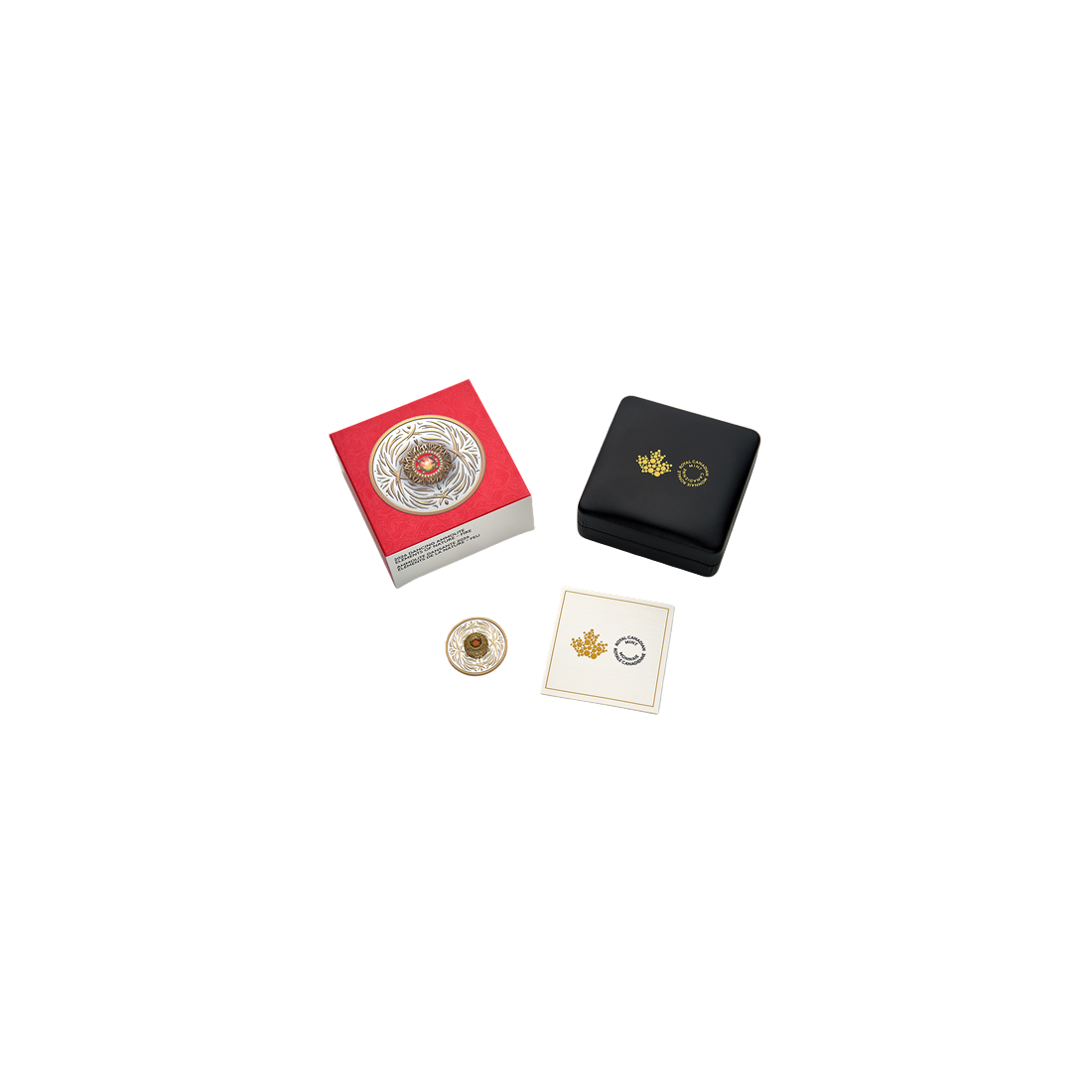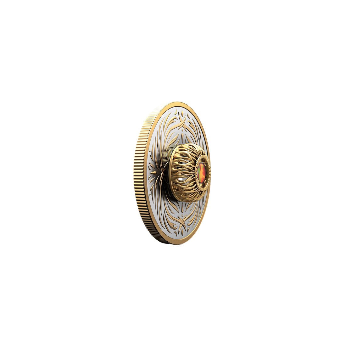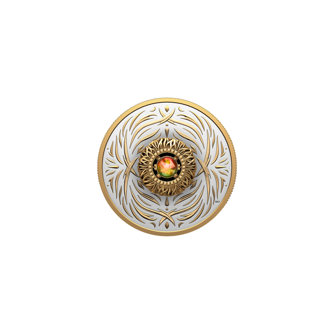 W centrum monety umieszczono 5-milimetrowy ammolit, pochodzący z formacji Bearpaw w Albercie. To jeden z najrzadszych kamieni szlachetnych na świecie, ceniony za swoją intensywną iryzację. W tej edycji kamień mieni się ognistymi odcieniami czerwieni, które idealnie korespondują z motywem przewodnim. Zastosowanie innowacyjnej, trójwymiarowej oprawy sprawia, że ammolit porusza się przy każdym nachyleniu monety, imitując żywy, tańczący płomień. Precyzyjne, selektywne złocenie na rewersie podkreśla dynamiczne linie płomieni, nadając całości luksusowy charakter.