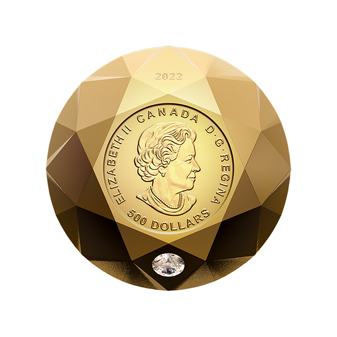 Centralnie na monecie znajduje się wizerunek Jej Królewskiej Mości Królowej Elżbiety II, autorstwa utalentowanej artystki Susanny Blunt. Wokół postaci monarchy znajdziesz napisy: „CANADA”, „ELIZABETH II”, „DG REGINA” oraz nominał „500 DOLARÓW”. Rok bicia, „2022”, został wygrawerowany na jednej z głównych fasetek korony. Symetrycznie do niej umieszczono diament o wadze 0,2 karata, który kontrastuje pięknie z blaskiem czystego złota.
